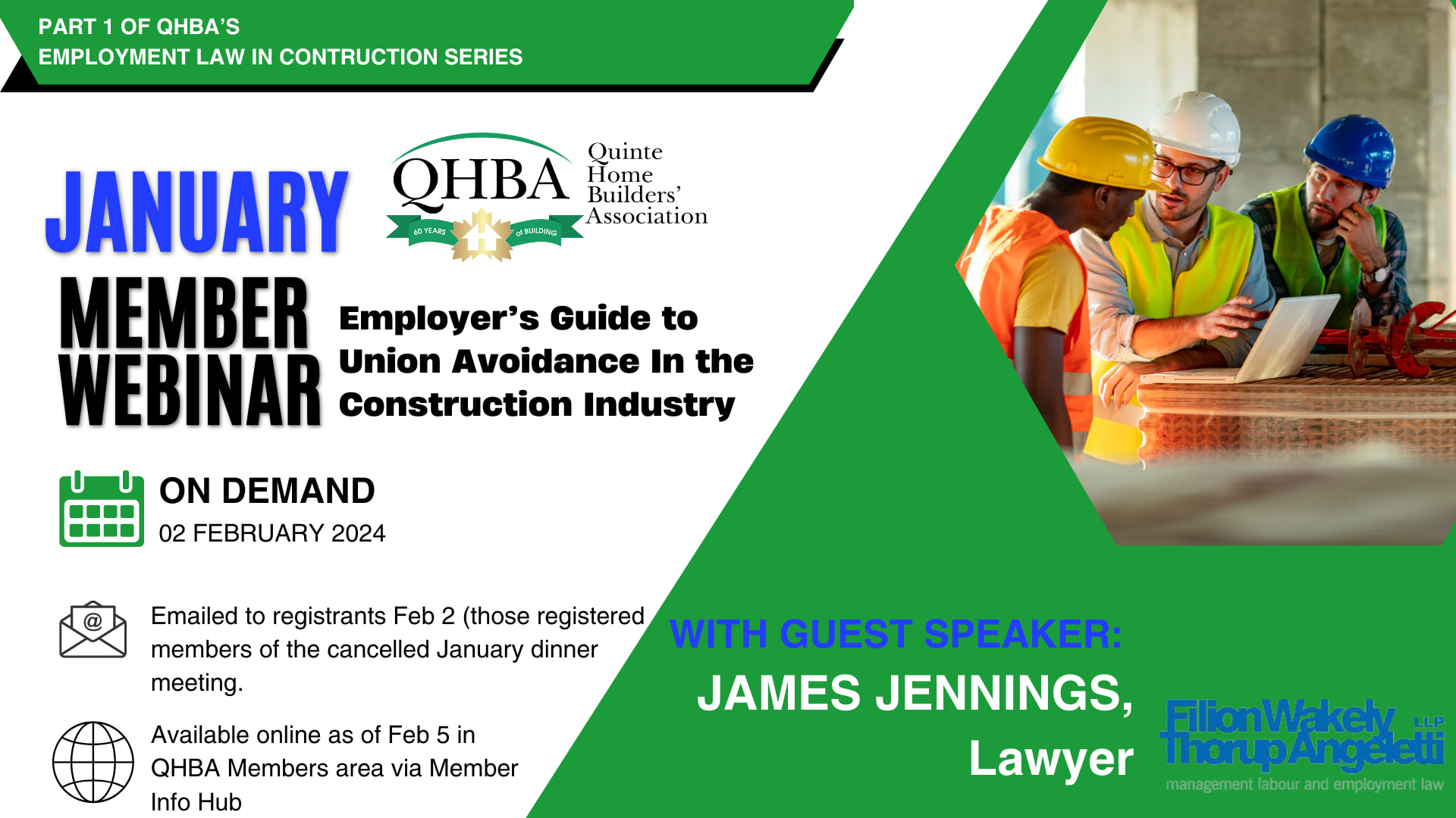 With unionized builders and contractors saturating the Toronto market, the Quinte Region is expected to see a considerable growth in union organizing activity as trade unions look to grow their presence east of the city. To successfully defend against a union organizing campaign, it is imperative for companies to understand the union organizing process and current trends in the construction industry. Join James Jennings for this informative presentation regarding the practical steps that construction employers can take to guard against union organizing campaigns and how to respond when a union comes knocking.